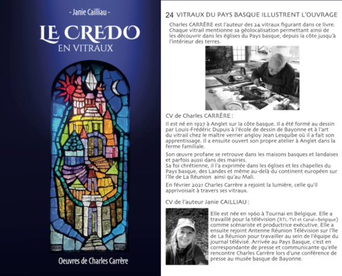 Janie Cailliau a choisi le Credo symbole des apôtres comme témoin de l’art et de la foi du verrier. Elle a imaginé un dialogue pour poser ses questions sans filtre à Charles Carrère. Les réponses du verrier vont petit à petit mener le lecteur vers la lumière.